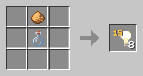 1 Poudre Glowstone + 1 Bouteille = 8 Blocs de lumière (intensité 12)