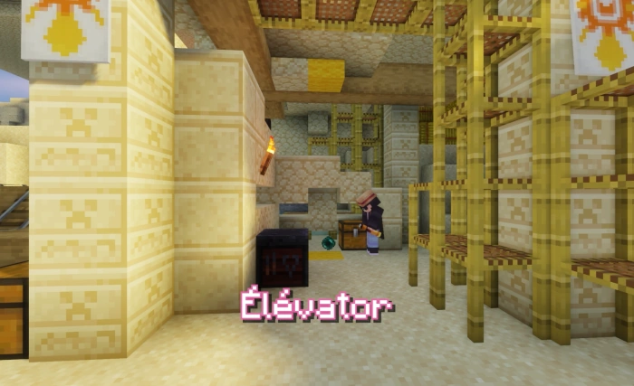 Élévator = en jettant 2 perles de l’ender au dessus de deux blocs de laine différents, posé l’un au dessus de l’autre, il est possible de se téléporter du premier bloc vers l’autre. En sautant, vous montez, en vous baissant, vous descendez. Pas très clair ? Regardez la bande annonce !
